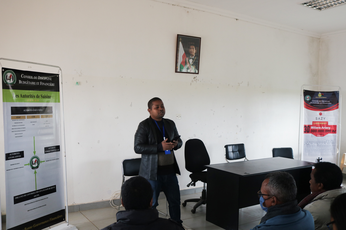 M. BERA Landrie, Chef du Service des Actions de Prévention, a, pour sa part, fait l’historique du CDBF et rappelle le thème de la journée : « le CDBF et le contrôle de la gestion des finances publiques ». En réaction aux nombreuses questions relatives aux difficultés rencontrées, il rappelle que le respect des procédures, textes et lois est de rigueur afin d’éviter une éventuelle mésaventure dans les locaux du CDBF ou tout autre organe de contrôle des finances publiques. A cet égard, il rappelle aux acteurs budgétaires présents, les principes budgétaires essentiels en matière de gestion des finances publiques que sont, notamment, l’annualité, la spécialité, l’unité et l’universalité, et la séparation de la fonction d’ordonnateur et de comptable. Pour autant, il fait remarquer qu’il est souvent judicieux de capitaliser sur l’expérience d’autres municipalités afin de mieux faire face aux difficultés inhérentes à la gestion des finances locales à Madagascar, comme le partenariat avec le district concerné pour le recouvrement fiscal.