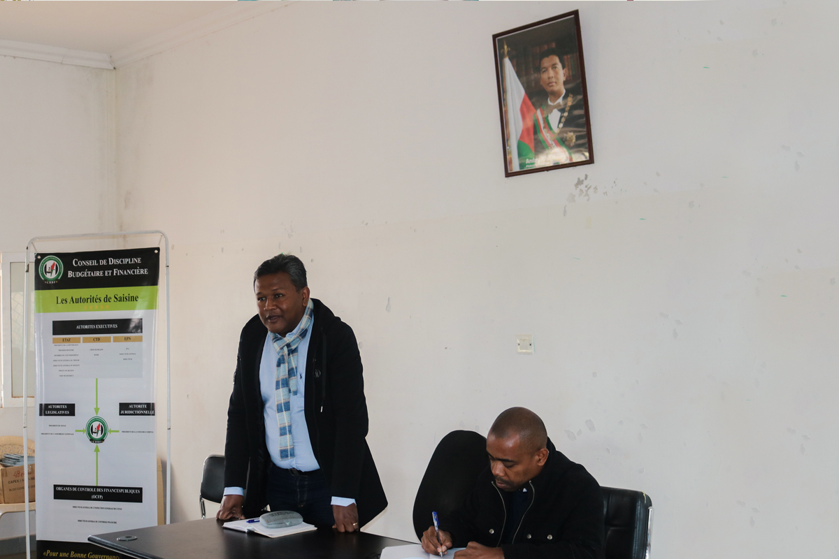 Monsieur le Maire, M. ANDRIANAHO Rainizaivelo, son adjoint, ainsi que le président du Conseil Municipal et une quinzaine d’acteurs budgétaires assistent à cette séance. La rencontre débouche sur un échange fructueux à propos des difficultés de la mise en application des textes et lois régissant les finances locales au vu des multiples facettes de la réalité et des besoins de la localité. Des recommandations ont ainsi été émises afin de se conformer à la législation en vigueur tout en satisfaisant, autant que possible, les besoins de la Commune. Enfin, des expériences ont été partagées afin d’exploiter au mieux la totalité des sources de financement autorisées par les textes et d’optimiser la stratégie de recouvrement fiscal.