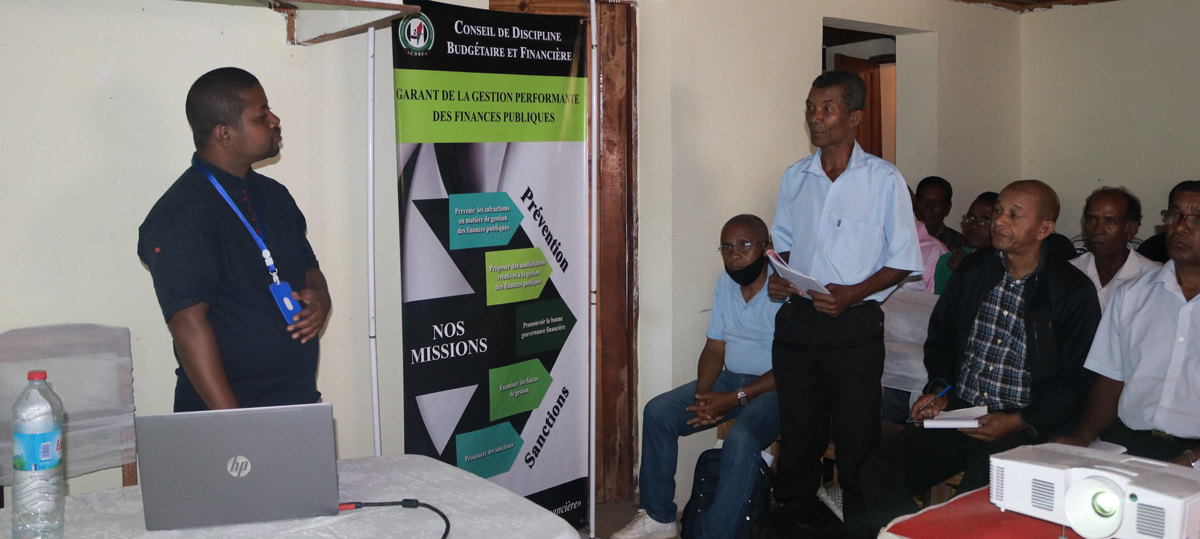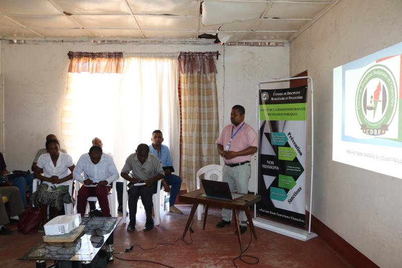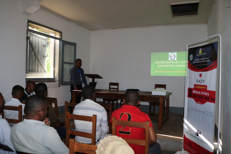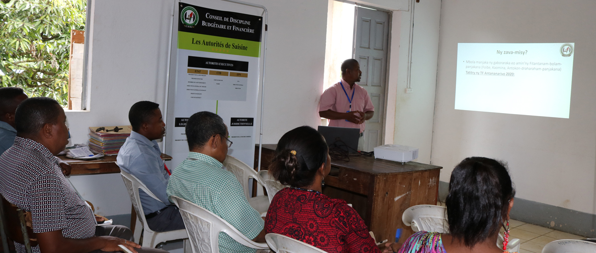 Dans le cadre de la mise en œuvre des actions de prévention des fautes de gestion relatives aux recettes et dépenses publiques, le Conseil de Discipline Budgétaire et Financière représenté par une équipe de la Direction de la Prévention a réalisé une mission dans les Régions Analanjorofo et Atsinanana du 07 au 20 novembre 2020. Cette action a été conduite afin de promouvoir la bonne gouvernance des finances publiques au niveau des collectivités locales. Les actions menées concernent l’information des dirigeants locaux, des acteurs budgétaires ainsi que des parties prenantes sur l’opérationnalité et les missions attribuées au CDBF, et la sensibilisation et l’éducation de ces acteurs sur les différentes fautes de gestion pouvant les faire traduire devant ledit Conseil.